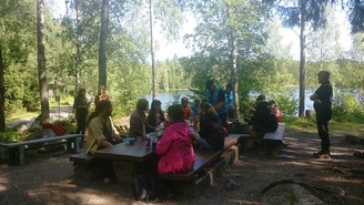 Ruokatauon jälkeen rauhoituttiin vielä piirin puiden ja kivien juureen. Kuunneltiin rauhallinen Metsälaulu ja puhuttiin luonnon hyvinvointivaikutuksista. Lopuksi etsittiin luontokorteista mieluisa maisema tai yksityiskohta ja käytiin loppupiirissä läpi kuvat.