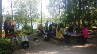 Paikalle oli saapunut 17 retkeilijää,joista Pauli ja Jari toimi loistavina nuotiomestareina. Alkuun teimme 1,5 tunnin hyvinvointiretken luontopolulla. Pysähdyimme matkalla tekemään Metsämieli-harjoituksia, joissa mm. rentouduttiin, rauhoituttiin ja pohdittiin hyviä tekoja.