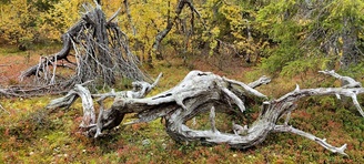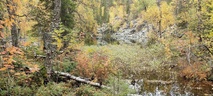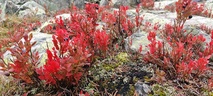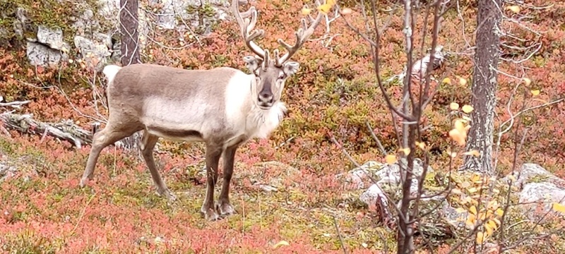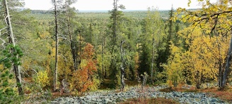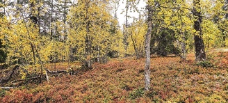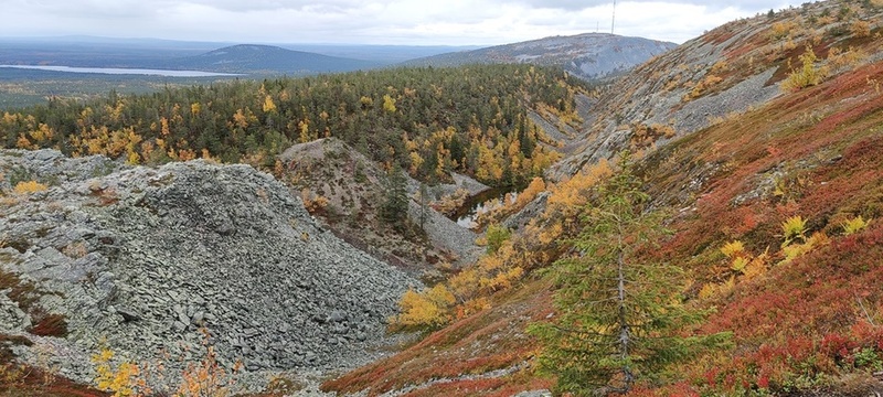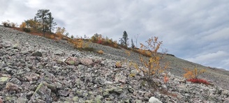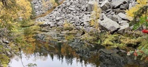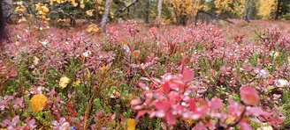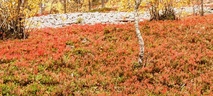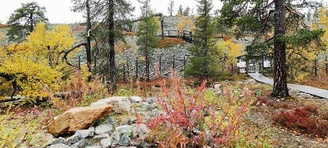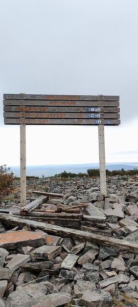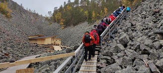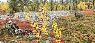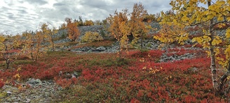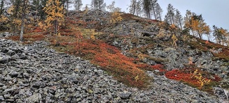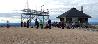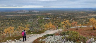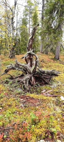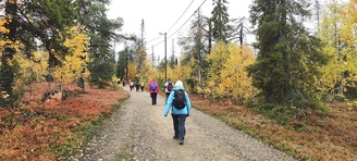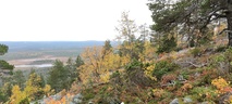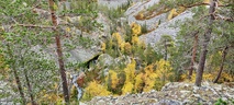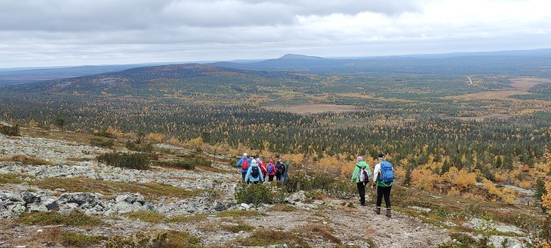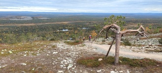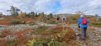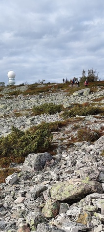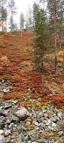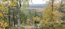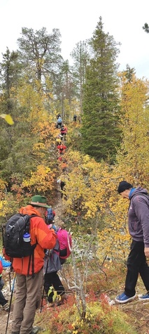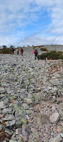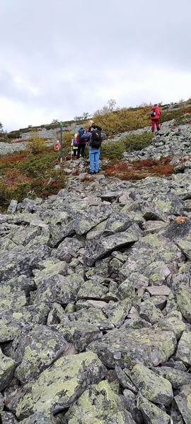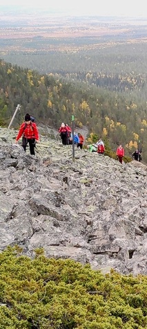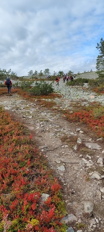 (tultu 4km / 2h, 290 m korkeudessa ollaan). Ei muuta kuin kohti tuntematonta. Polun hyväkuntoisuus on pelkkä muisto vain. Nyt alettiin ottamaan luuloja pois. Reilun kilometrin matka kohtalaisen jyrkkää nousua. Oli pienempikivisiä polkuja ja lopussa kivenlohkareita, jonkinmatkaa täytyi tulla "nelivedolla", että pysyi jyrkässä nousuissa pystyssä. Ruska ja maisemat olivat todella upeita , ja ylöstulon rasitukset unohtuivat. 3,5 tunnin, 5,5km matkan ja 300m nousun jälkeen kaikki selvisivät "ehjänä" Noitatunturin huipulle.