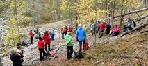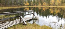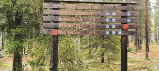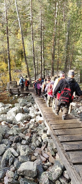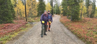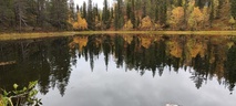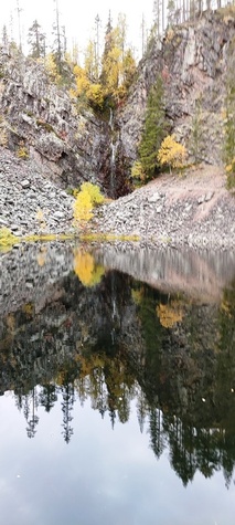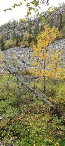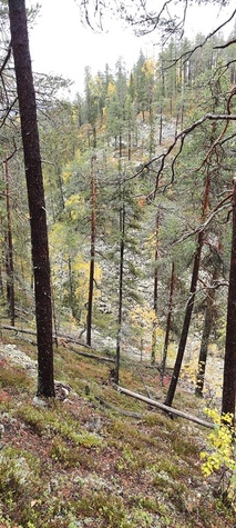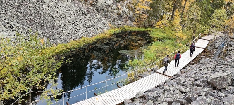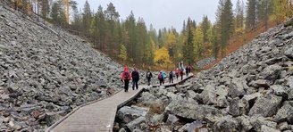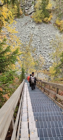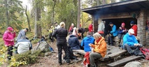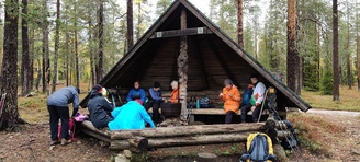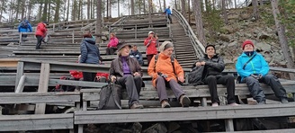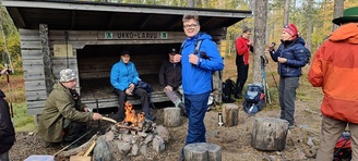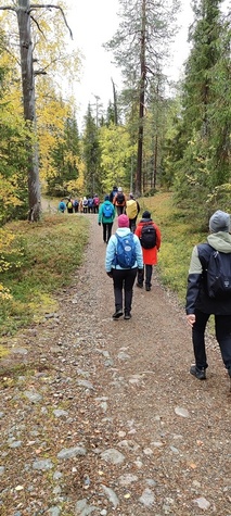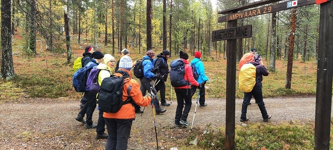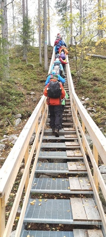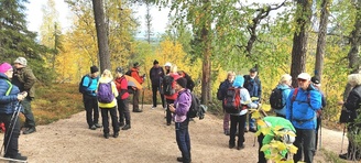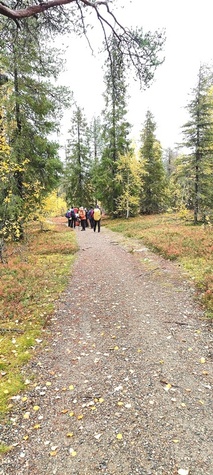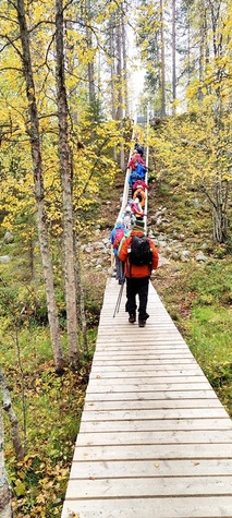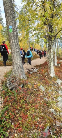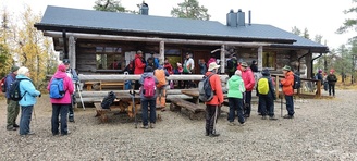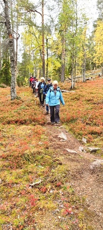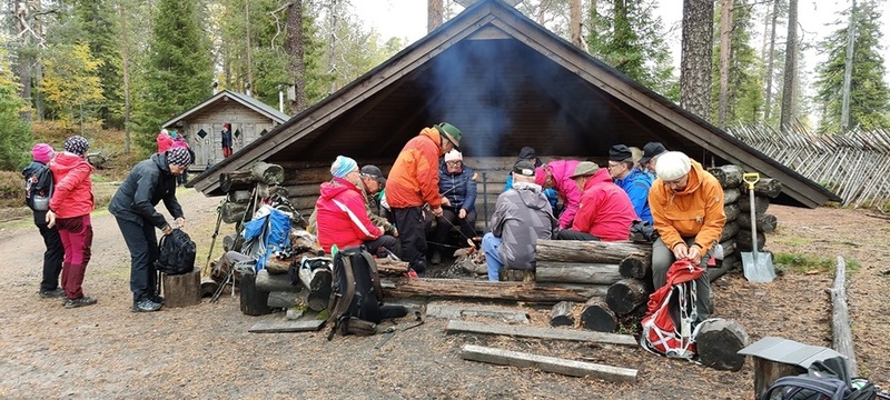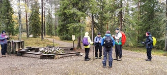 Kyllä oli hymy kaikilla herkässä. Pienen voimankeräilyn jälkeen alkoikin vähän helpompi myötämäki. Ruskaa ja maisemaa oli nyt hyvä kuvata. Laskeuduimme Karhunjuomalammen ja Pyhän kasteen putouksen kautta Isokurun kodalle, jossa evästeltiin laavulla ja syöteltiin kuukkeleta. Vielä myötämäkeä pitkin kohti bussia. Vaelluksen pituus 12 km 6,5 tuntia